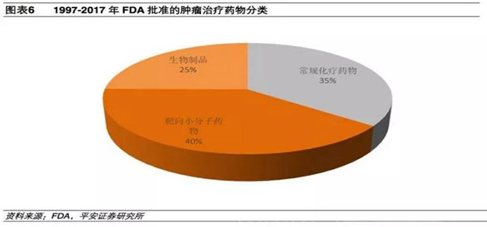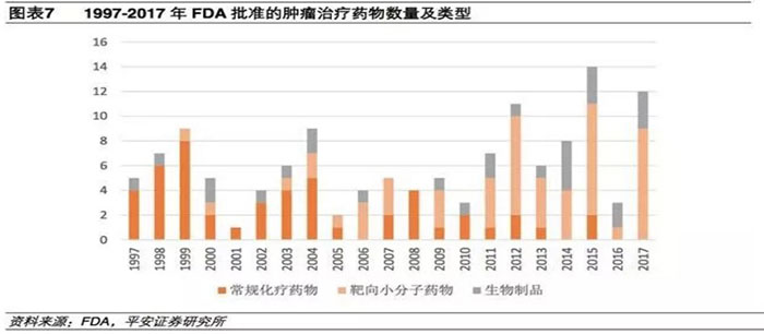 2015年批準的14個抗腫瘤藥物中,靶向(xiàng)藥物達到12個,2016、2017年批準的全部都(dōu)是靶向(xiàng)藥物。