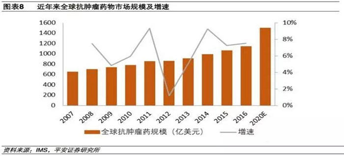 患者的持續用藥和抗腫瘤新藥的高昂價格將(jiāng)推動這(zhè)個市場繼續保持高增長(cháng),據IMS預測到2020年,抗腫瘤藥物整體市場規模將(jiāng)超過(guò)1500億美元。