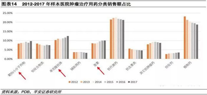 與國(guó)外以靶向(xiàng)小分子、單抗藥物爲主導不同,國(guó)内抗腫瘤治療手段以傳統藥物爲主,抗代謝類、鉑類、抗生素、植物藥和烷化劑等傳統非靶向(xiàng)藥物在樣本醫院仍然占據可觀的市場規模,雖然相比2012年占比70%略有下降,但目前占比仍然達65%。