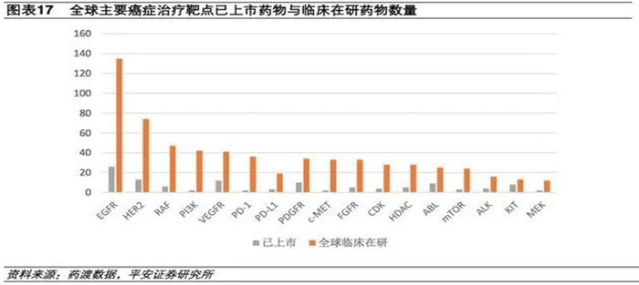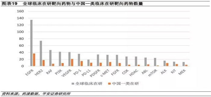 當前國(guó)内處于在研階段的一類抗腫瘤藥物項目超過(guò)200個,國(guó)内的靶向(xiàng)藥物主要集中在VEGFR、PDGFR、EGFR、HER2等開(kāi)發(fā)較爲充分的靶點,而國(guó)際上一些新型熱門靶點如信号轉導因子受體Raf、PI3K等、細胞周期激酶(CDK)等,國(guó)内研究較少。