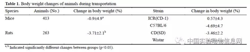 大鼠與小鼠運輸前後(hòu)體重變化[3]