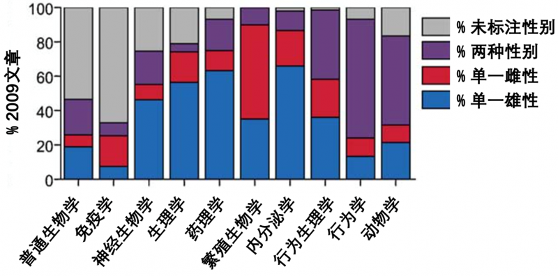 2011年加州大學(xué)伯克利分校的Annaliese K. Beery和Irving Zucker在《神經(jīng)科學(xué)與生物行爲評論》上發(fā)表了一篇關于生物醫學(xué)研究中使用實驗動物的性别分布的統計分析文章。他們選取了包括Nature和Science在内的34種(zhǒng)生物醫學(xué)期刊,針對(duì)其發(fā)表在2009年神經(jīng)生物學(xué)、免疫學(xué)、生殖生物學(xué)等十個學(xué)科的論文中所用實驗動物的性别标注情況進(jìn)行了調查。結果顯示隻有28%的動物實驗中标注了同時(shí)使用雌雄實驗動物。不幸的是,除了繁殖生物學(xué)外,所有的學(xué)科都(dōu)偏好(hǎo)于使用雄性動物。其中神經(jīng)生物學(xué)和藥理學(xué)實驗中對(duì)雄性動物偏好(hǎo)最爲突出,雄雌比分别達到了5.5:1和5:1。另一篇針對(duì)2011到2012年發(fā)表的1200篇神經(jīng)科學(xué)領域論文的類似分析也得出了同樣的結果——僅有24%的動物實驗中用了雌性實驗動物。